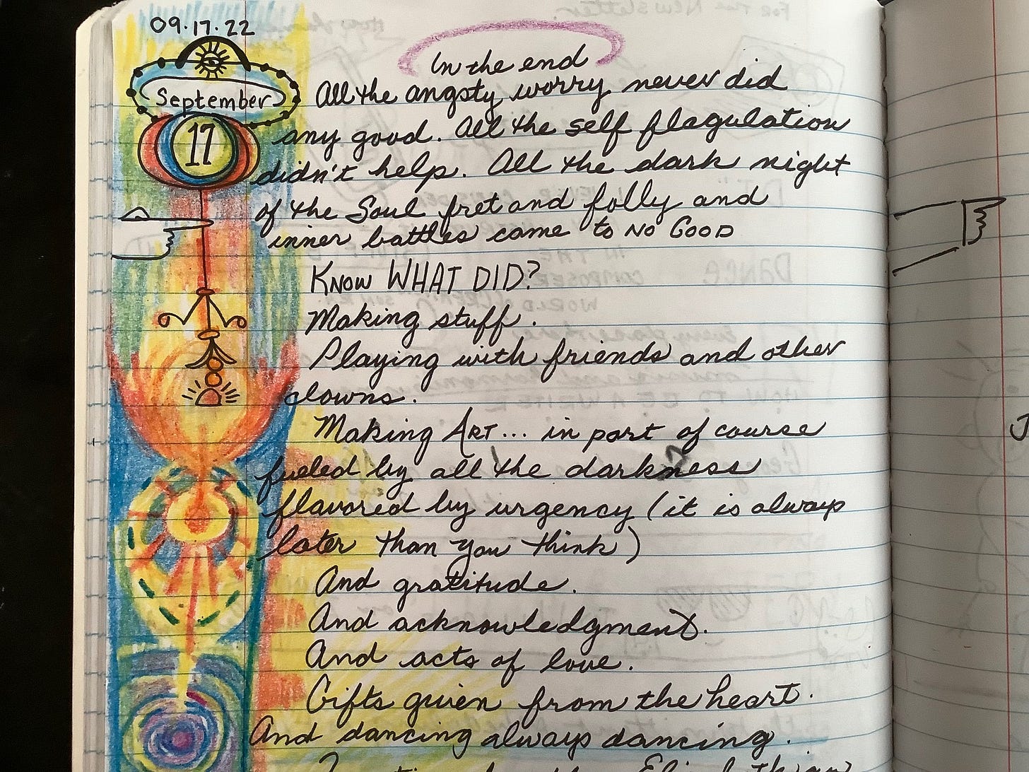 Crayon doodles in the margin of a composition notebook page with the following hand written in black ink in cursive